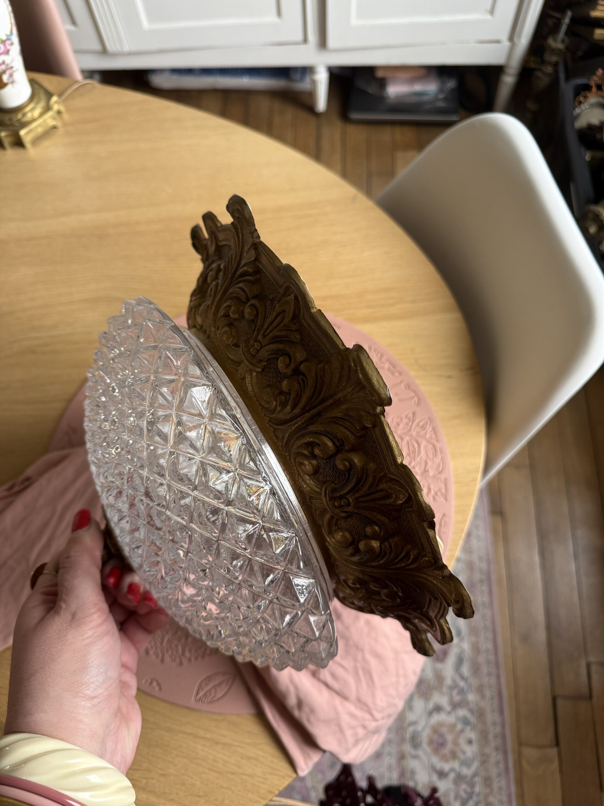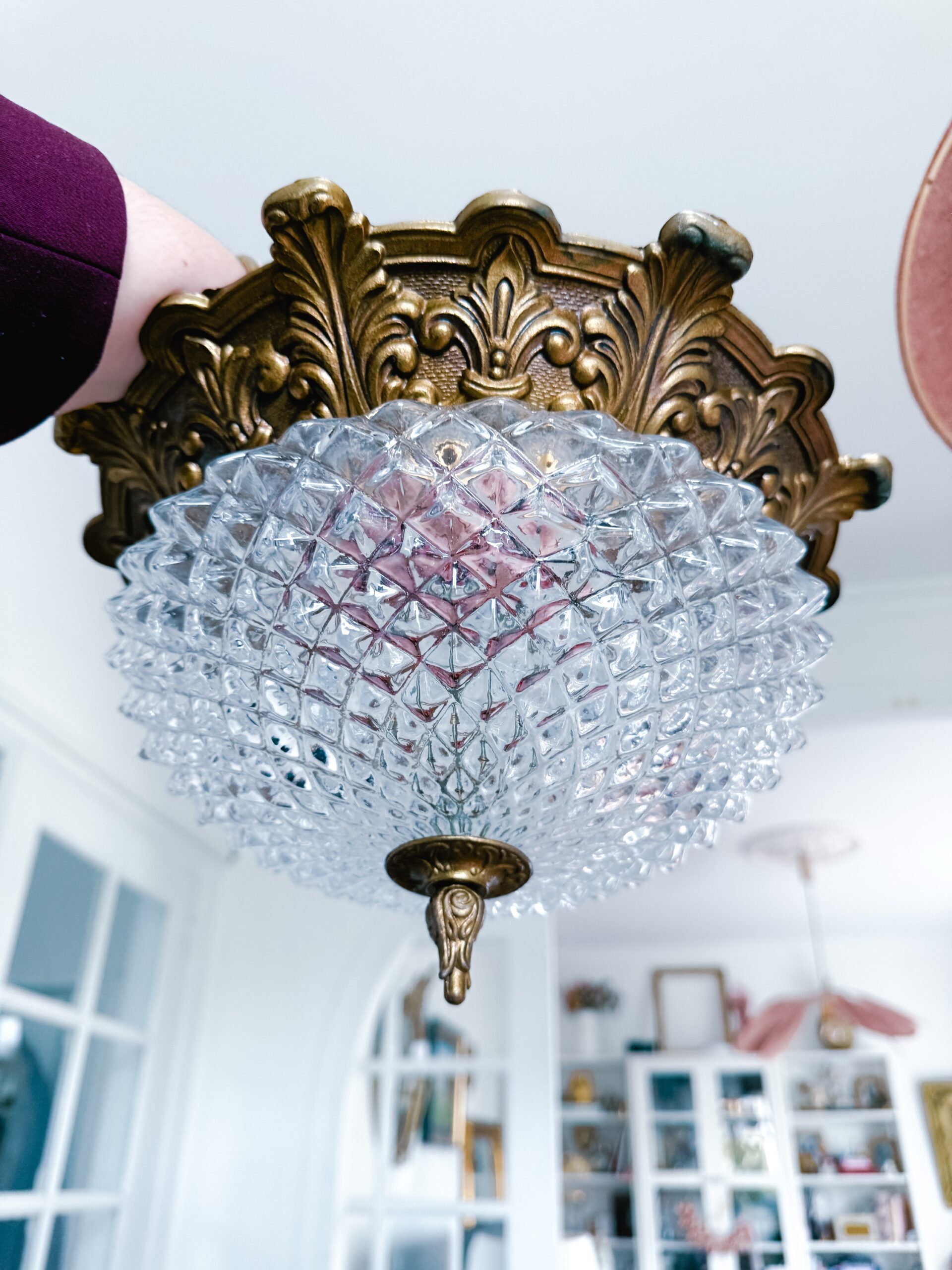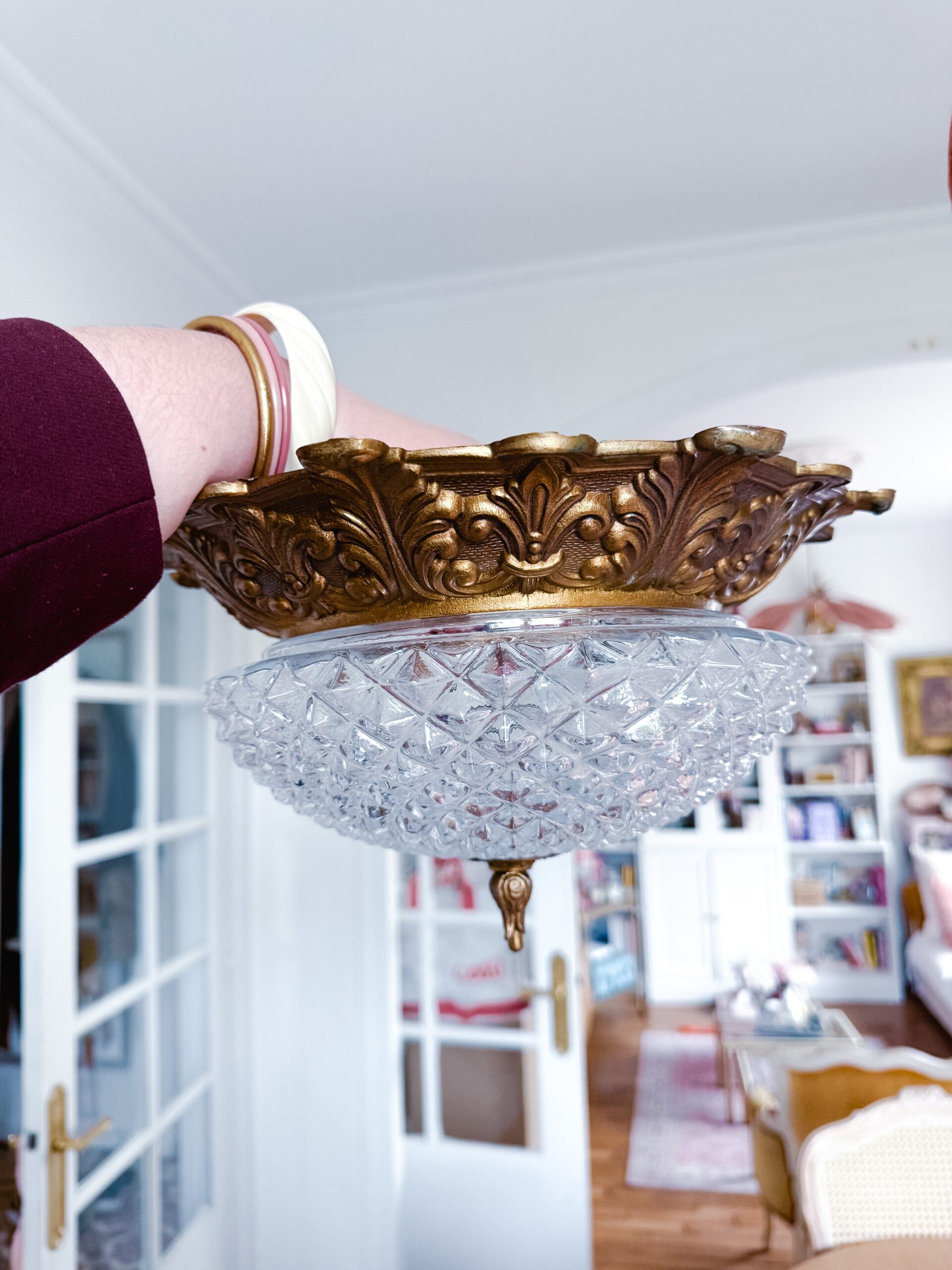 Vous allez craquer pour ce sublime plafonnier vintage en verre finement ciselé qui repose sur sa structure en bronze rocaille. A fixer au plafond, il saura éclairer votre salon, votre chambre…tout en apporter à votre pièce une touche chic !