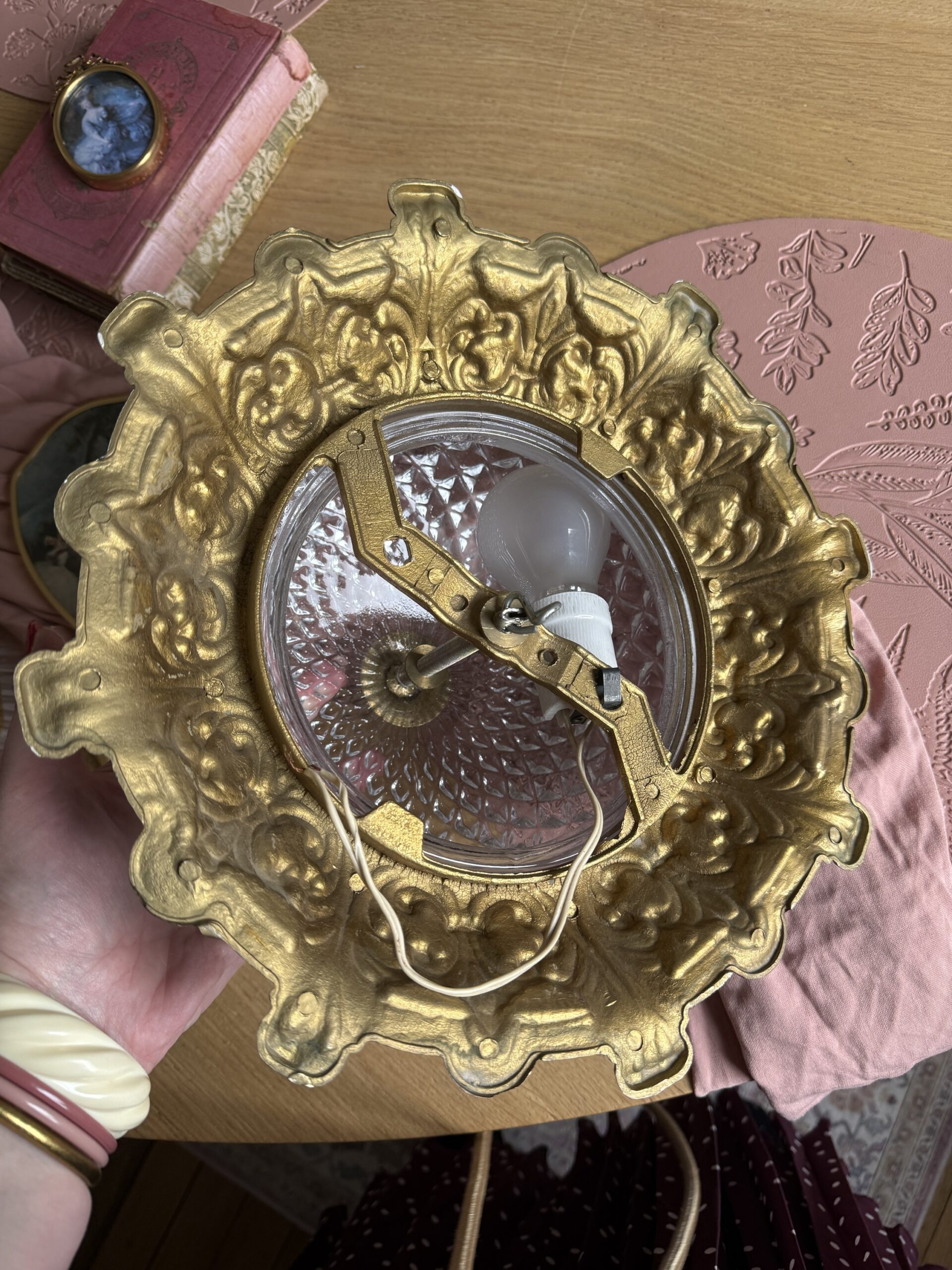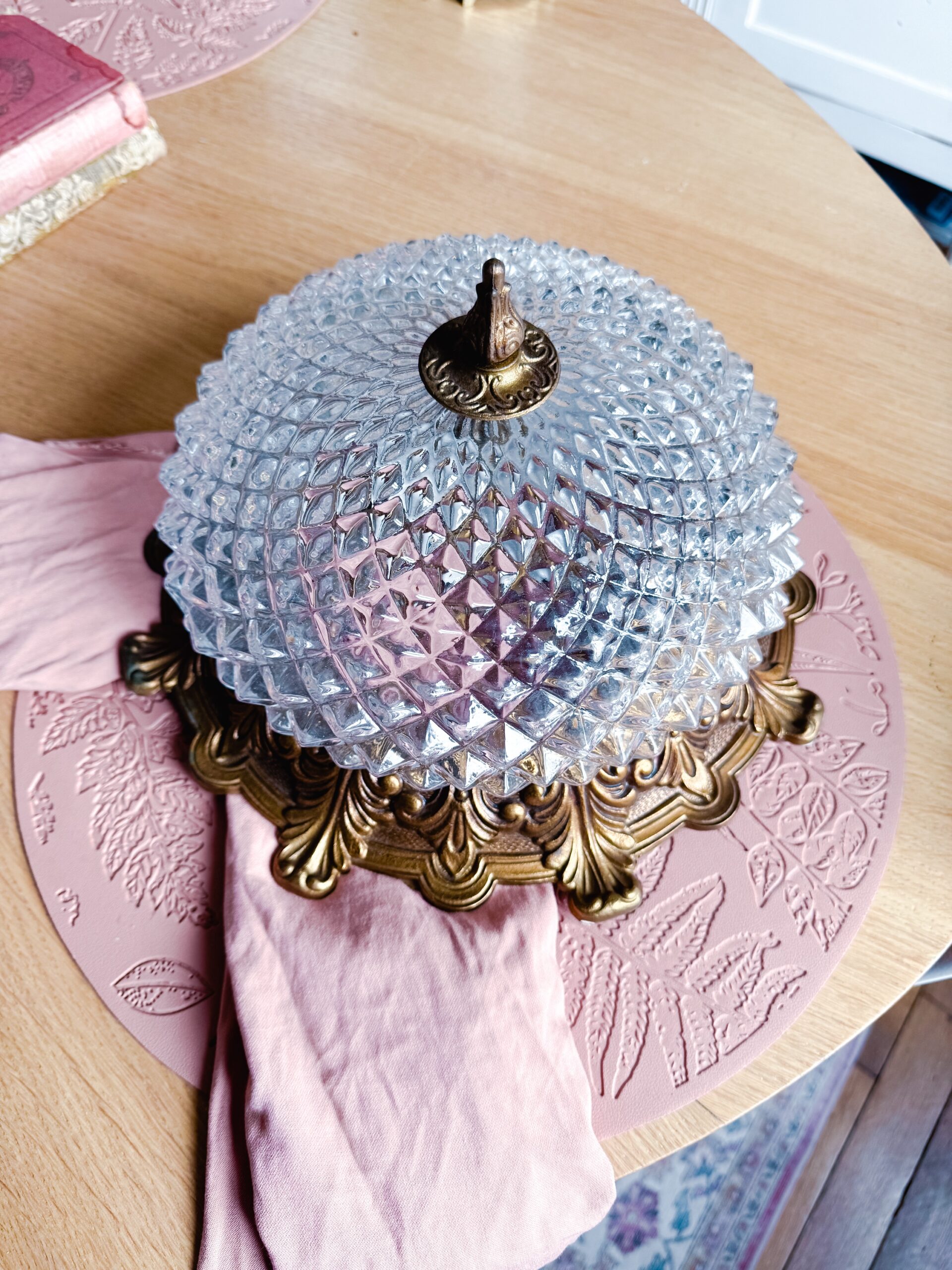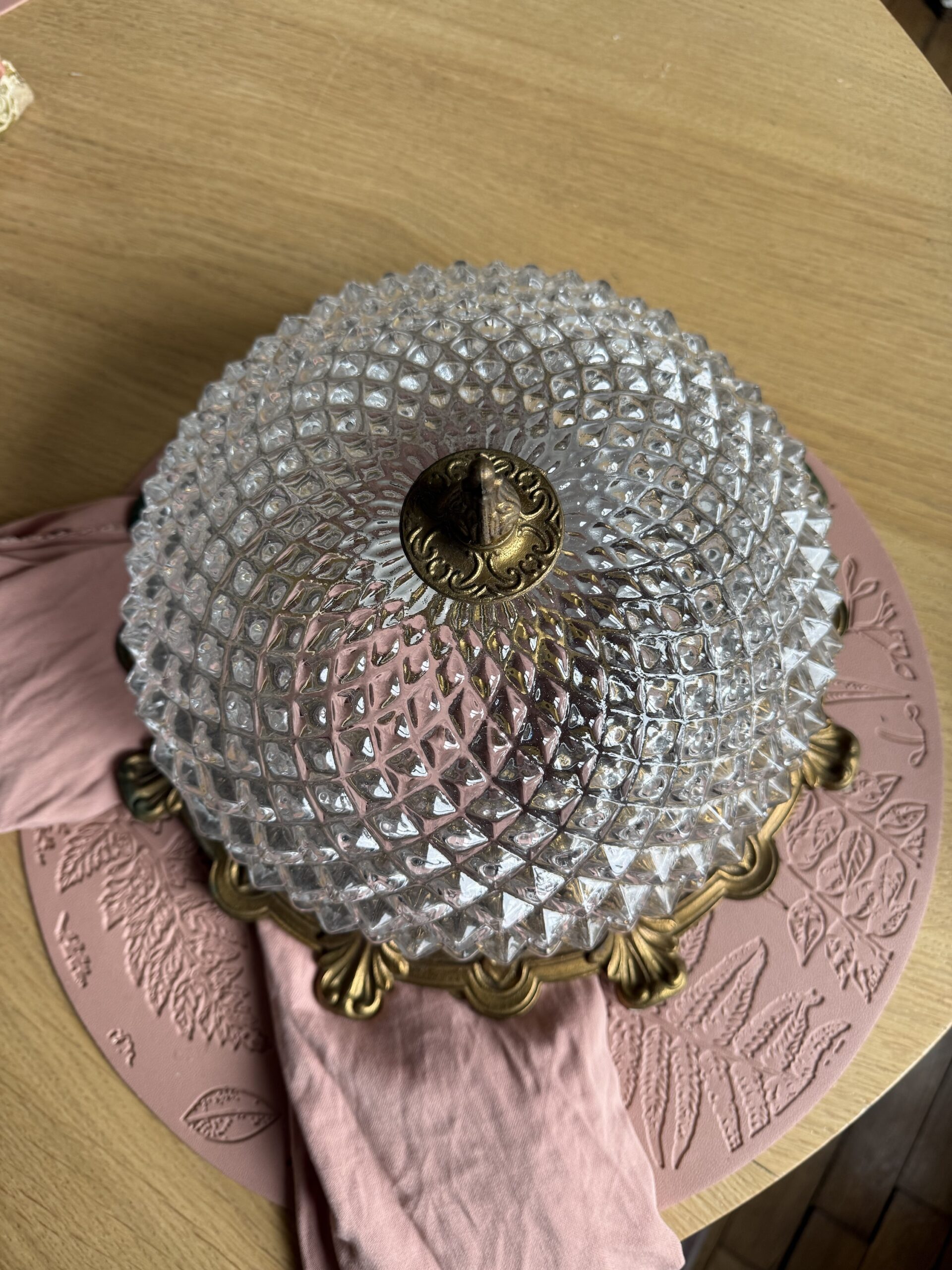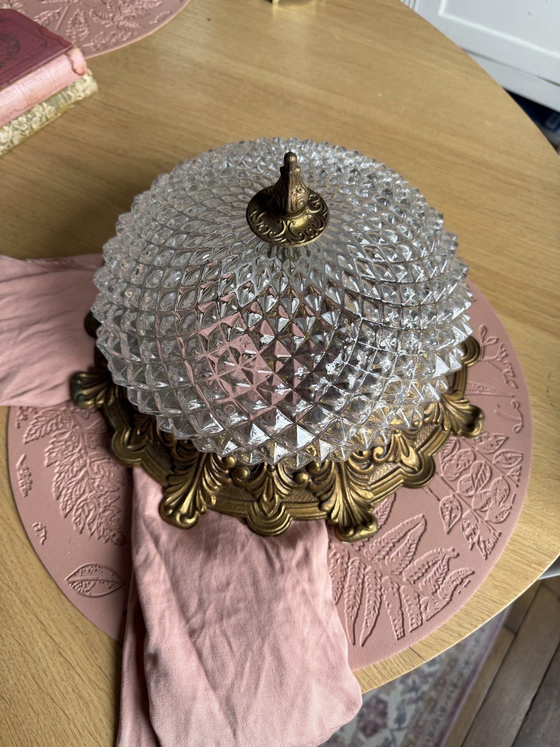 Vous allez craquer pour ce sublime plafonnier vintage en verre finement ciselé qui repose sur sa structure en bronze rocaille. A fixer au plafond, il saura éclairer votre salon, votre chambre…tout en apporter à votre pièce une touche chic !